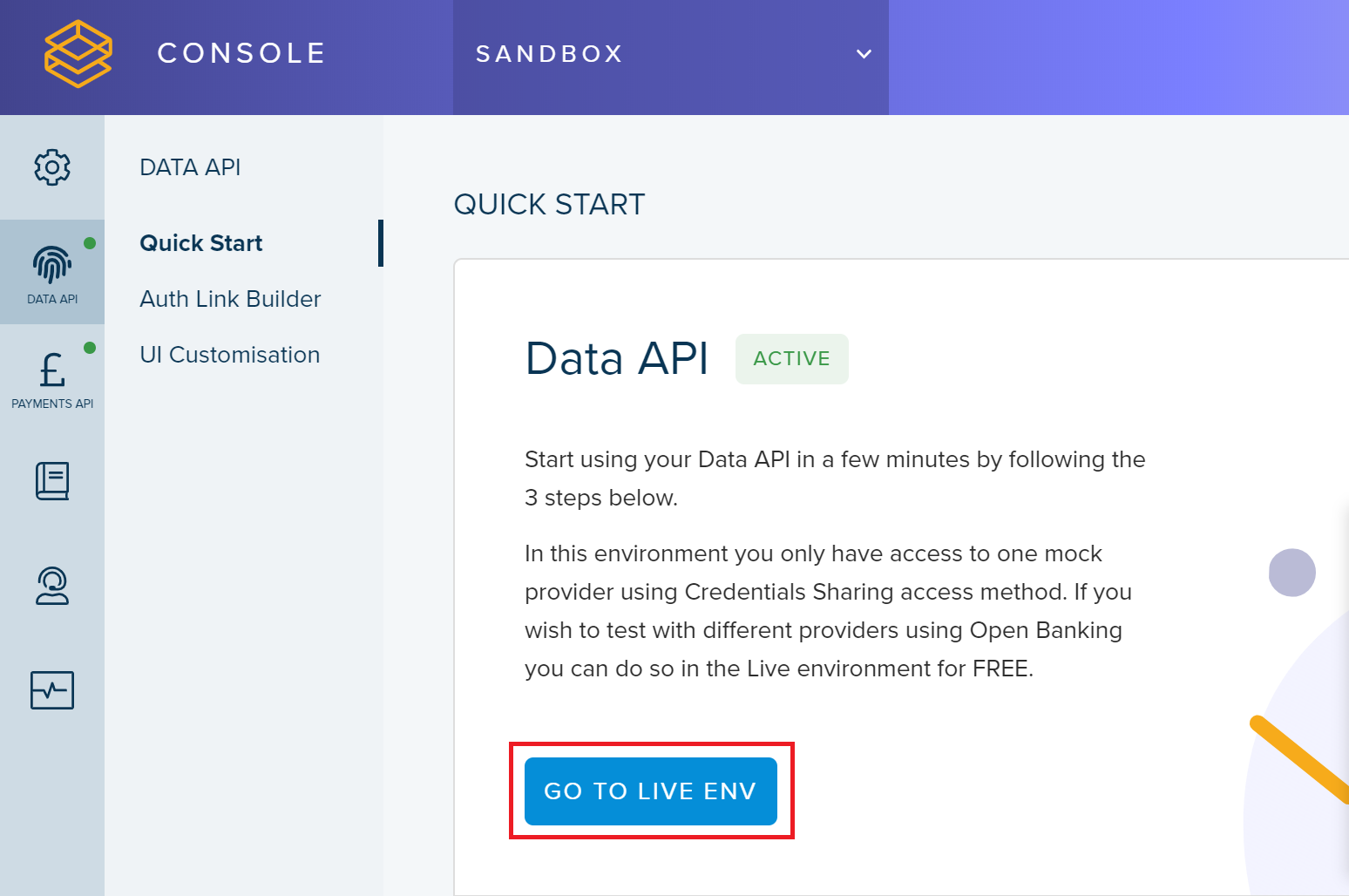 3. If you're using a new account, click GO TO LIVE ENV. If you're using an existing account, select LIVE from the top menu.