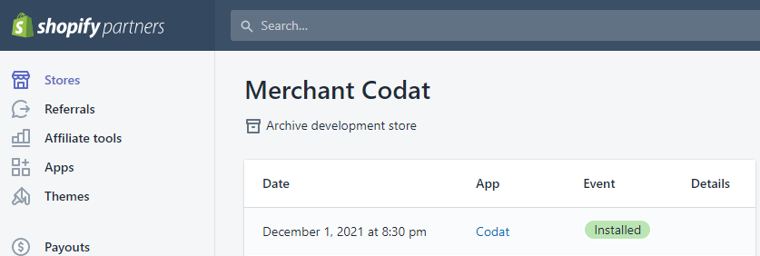 Test your Shopify integration by reading commerce data from a Development Store to a test companyCompany In Codat, a company represents your customer's business entity. Companies can have multiple connections to different data sources. in Codat. This lets you test the LinkLink The authorization flow that allows end users to connect their accounting, banking, or commerce platforms to your application via Codat. flow that your SMBSMB The primary customer segment that Codat helps businesses serve, typically companies with annual revenues under $500 million. customers will see when they share their commerce data from Shopify.
